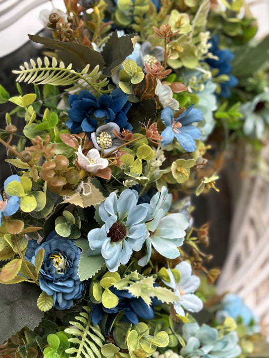 38CM WICKER WREATH BLUE/GREEN MIXED FOLIAGE